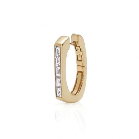 Pojedynczy kolczyk z kolekcji Linea włoskiej marki Tornaghi to prawdziwe arcydzieło współczesnej biżuterii. Wykonany z najwyższą precyzją, kolczyk został ozdobiony diamentowymi bagietami o łącznej wadze 0,70 karata, które urzekają swoim blaskiem i elegancją. Minimalistyczna forma podkreśla geometryczna harmonię, wprowadzając subtelną równowagę pomiędzy luksusem a nowoczesnym designem.