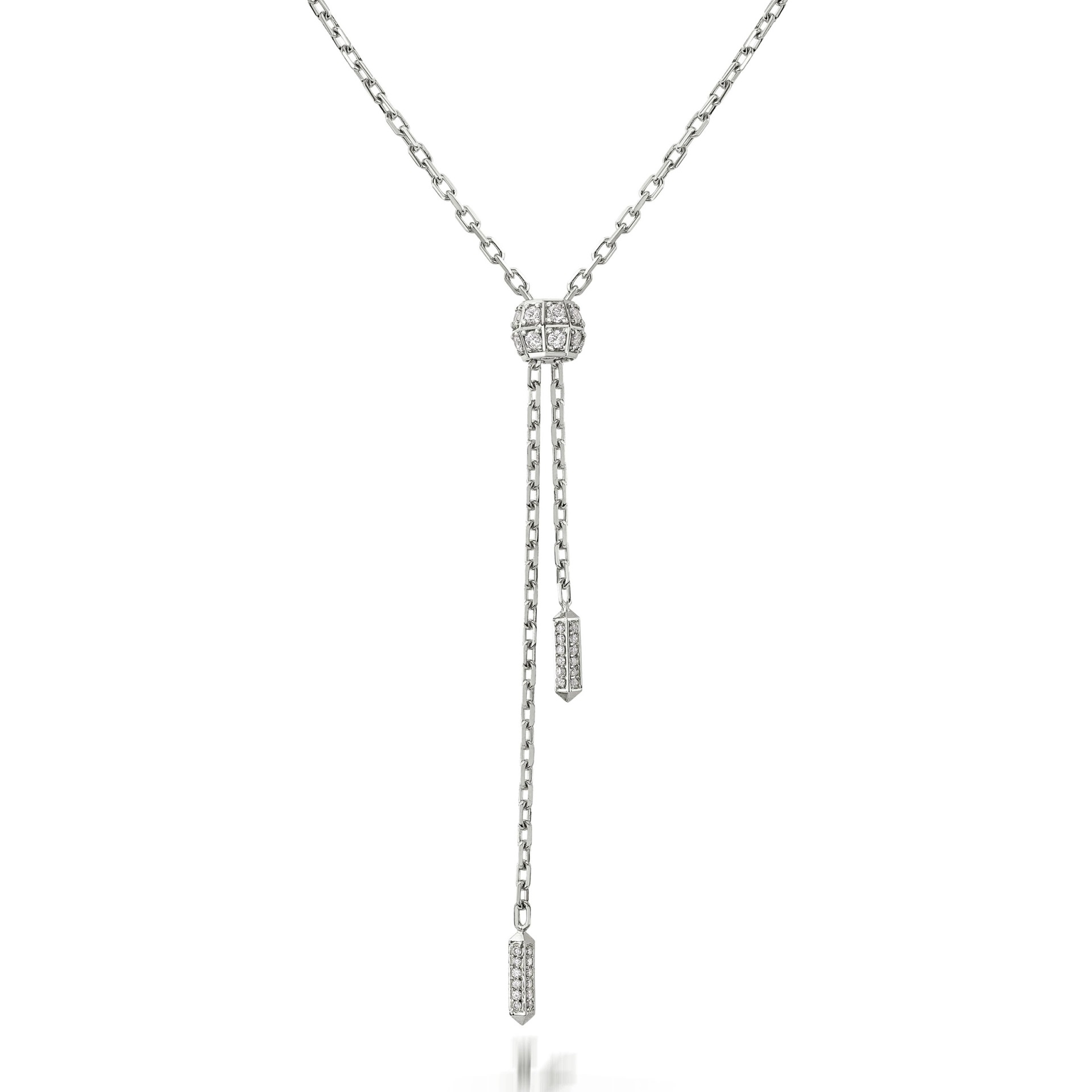 Poznaj wyjątkowy naszyjnik marki Tornaghi, który redefiniuje pojęcie nowoczesnej elegancji. Wykonany z 18-karatowego białego złota, zachwyca subtelnym blaskiem oraz perfekcyjnym rzemiosłem włoskich jubilerów. Jego długość – 80 cm – daje nieskończone możliwości stylizacji, a ruchoma kuleczka wysadzana diamentami pozwala dowolnie regulować układ naszyjnika, zmieniając go z długiego akcentu w zmysłowy choker lub warstwową kompozycję. Obie końcówki łańcuszka również zdobią diamentowe detale, które migoczą przy każdym ruchu. Ten projekt to balans między biżuteryjną finezją a nowoczesnym podejściem do klasycznej elegancji.