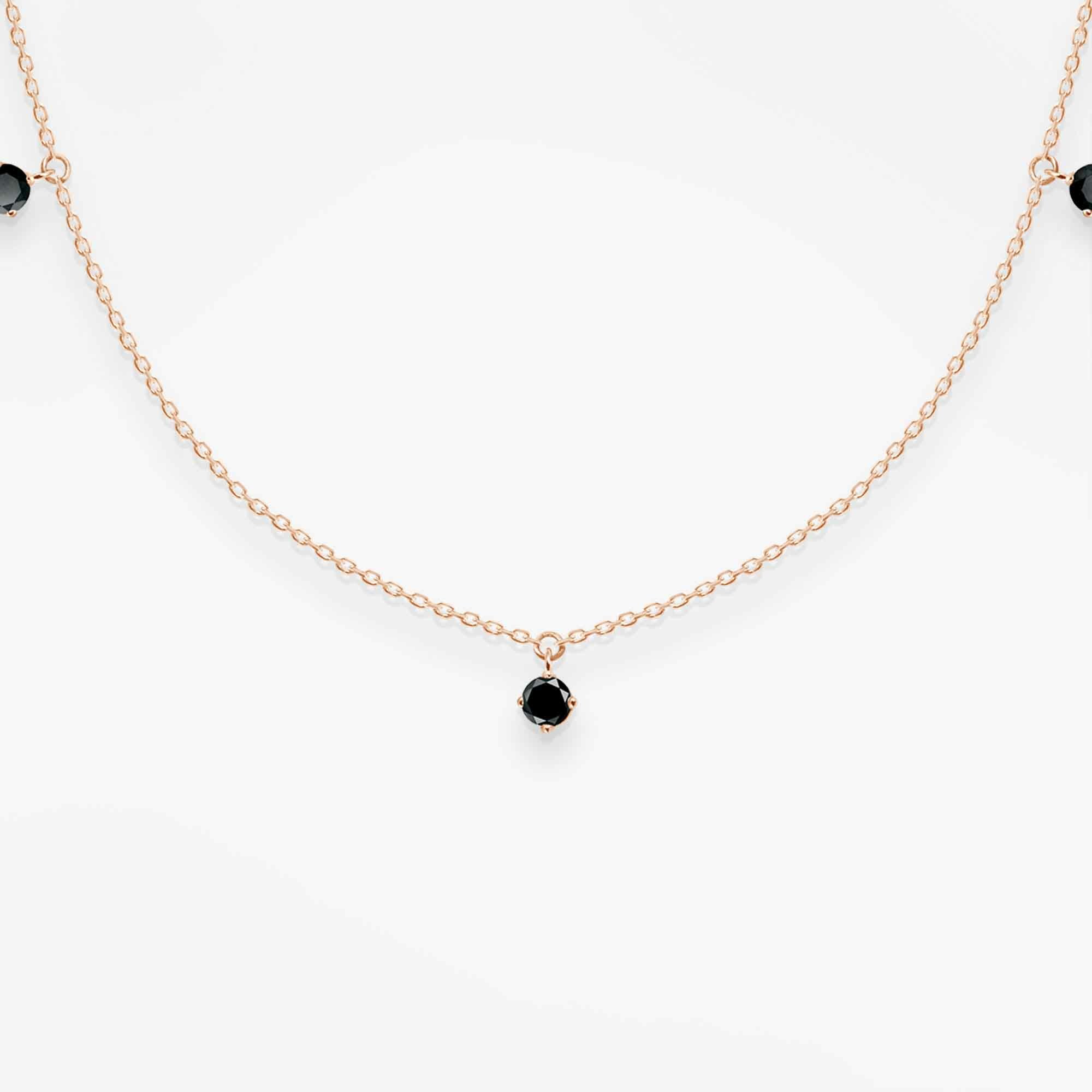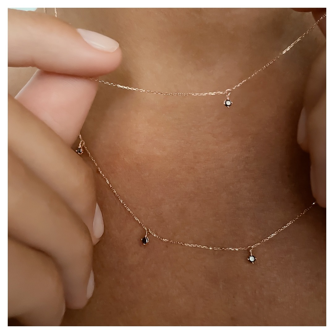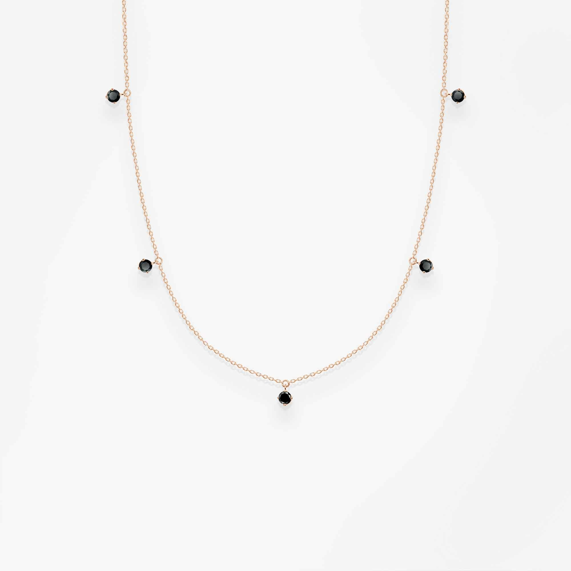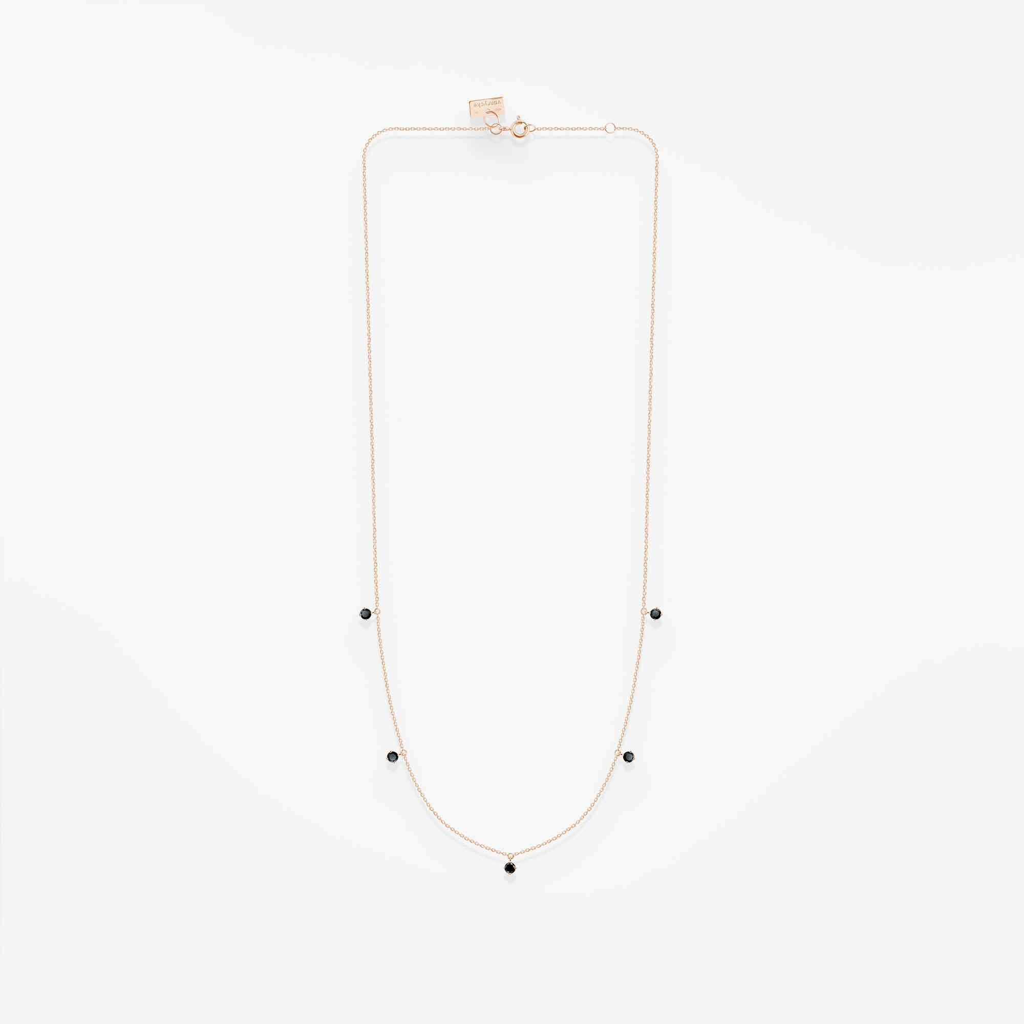 Poczuj ponadczasowość minimalizmu dzięki temu wykwintnemu naszyjnikowi. Zamknięty w 18-karatowym różowym złocie i ozdobiony pięcioma surowymi czarnymi diamentami przepięknie zdobi ciało i sprawi, że juz nigdy nie będziesz chciała go zdjąć. Efektowne połączenie czarnych diamentów z lśniącym różowym złotem nigdy nie wyglądało tak dobrze. Łańcuszek jest długi, co oznacza, że można go nosić solo lub w zestawie z innymi naszyjnikami z gamy Vanrycke.