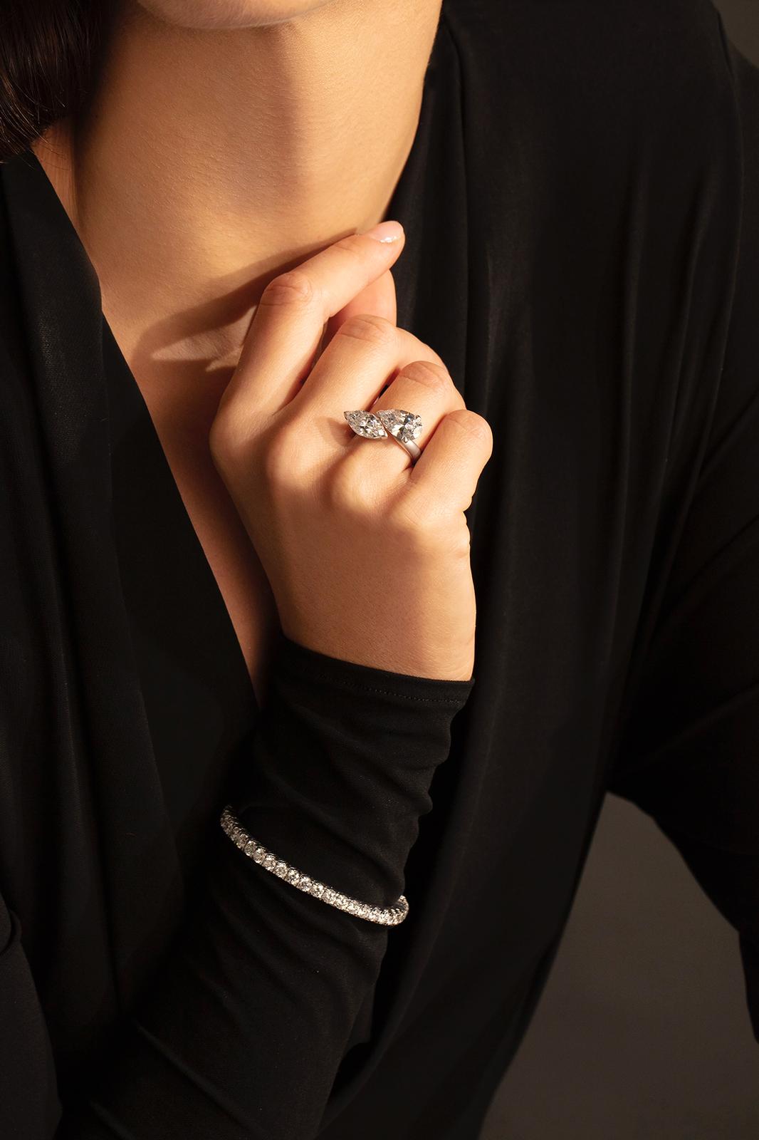 Otwarty pierścień Tornaghi to coś więcej niż piękna biżuteria. Zawiera w sobie dwa najcenniejsze kamienie – diamenty. Wykonany z 18-karatowego białego złota, zdobiony olśniewająco mieniącymi się diamentami o szlifie gruszki 2,47 karata oraz markizy 3,02 karata. Dwa diamenty które łączą się, tworząc ponadczasowy, unikatowy wygląd. Ten pierścionek jest idealny na dziś, na jutro, na zawsze.