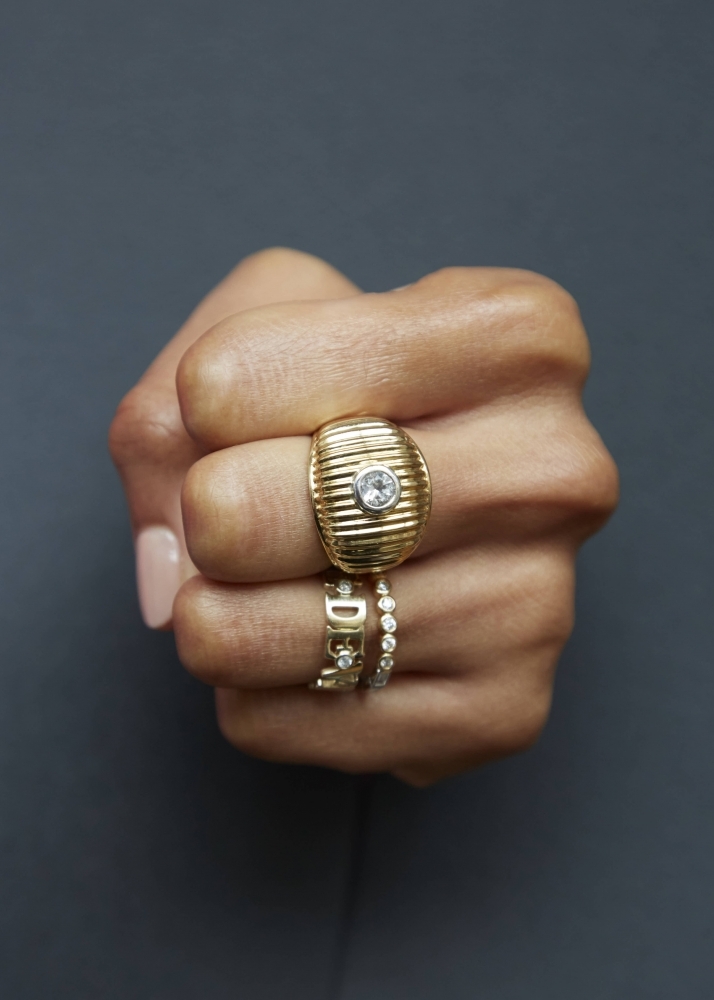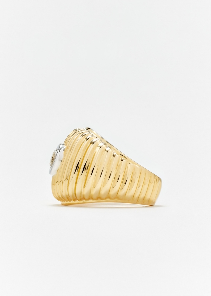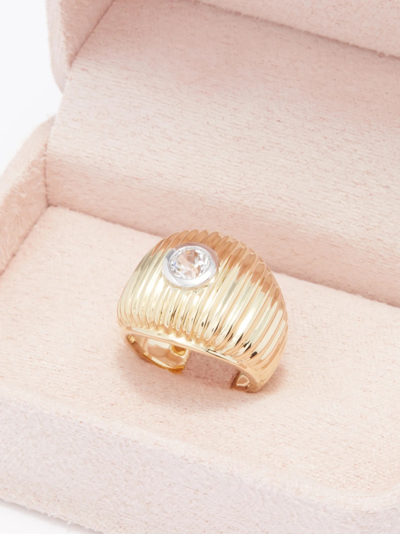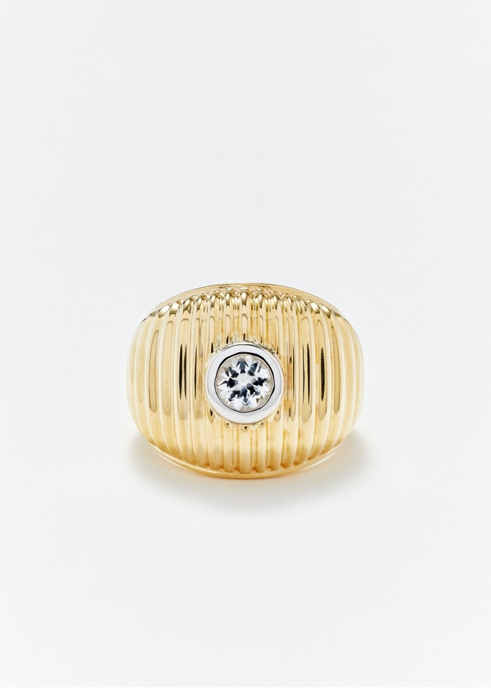 Złoty pierścionek Yvonne Léon wygląda jak skarb, który można znaleźć podczas przeczesywania targu staroci. Ten masywny kawałek biżuterii wykonany jest ręcznie w paryskim atelier z 9-karatowego żółtego złota. Ozdobiony w centralnym miejscu białym topazem o masie 0,55 karata, który przykuwa uwagę. Noś go na środkowym lub wskazującym palcu, aby uzyskać najlepszy efekt.