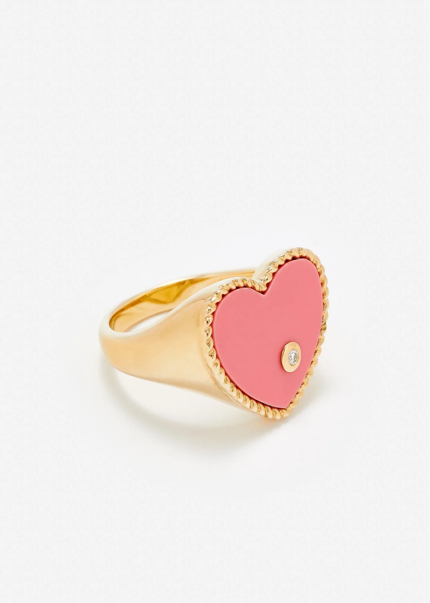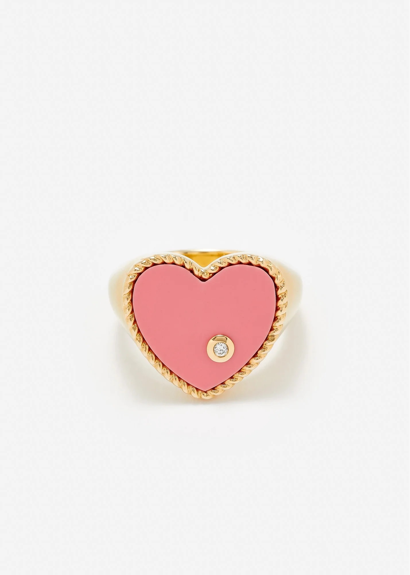 Sygnet w kształcie serca od Yvonne Léon Paris to harmonijne połączenie klasyki i nowoczesności, które przyciąga uwagę swoim unikalnym designem. Wykonany ręcznie w Paryżu z 9-karatowego żółtego złota, pierścień zdobi różowy koral otoczony plecionymi krawędziami oraz diament w oprawie zamkniętej, co nadaje mu wyjątkowego blasku. Sygnet serce to nie tylko symbol miłości i elegancji, ale także wyraz indywidualnego stylu, który doda romantycznego akcentu każdej kolekcji biżuterii.