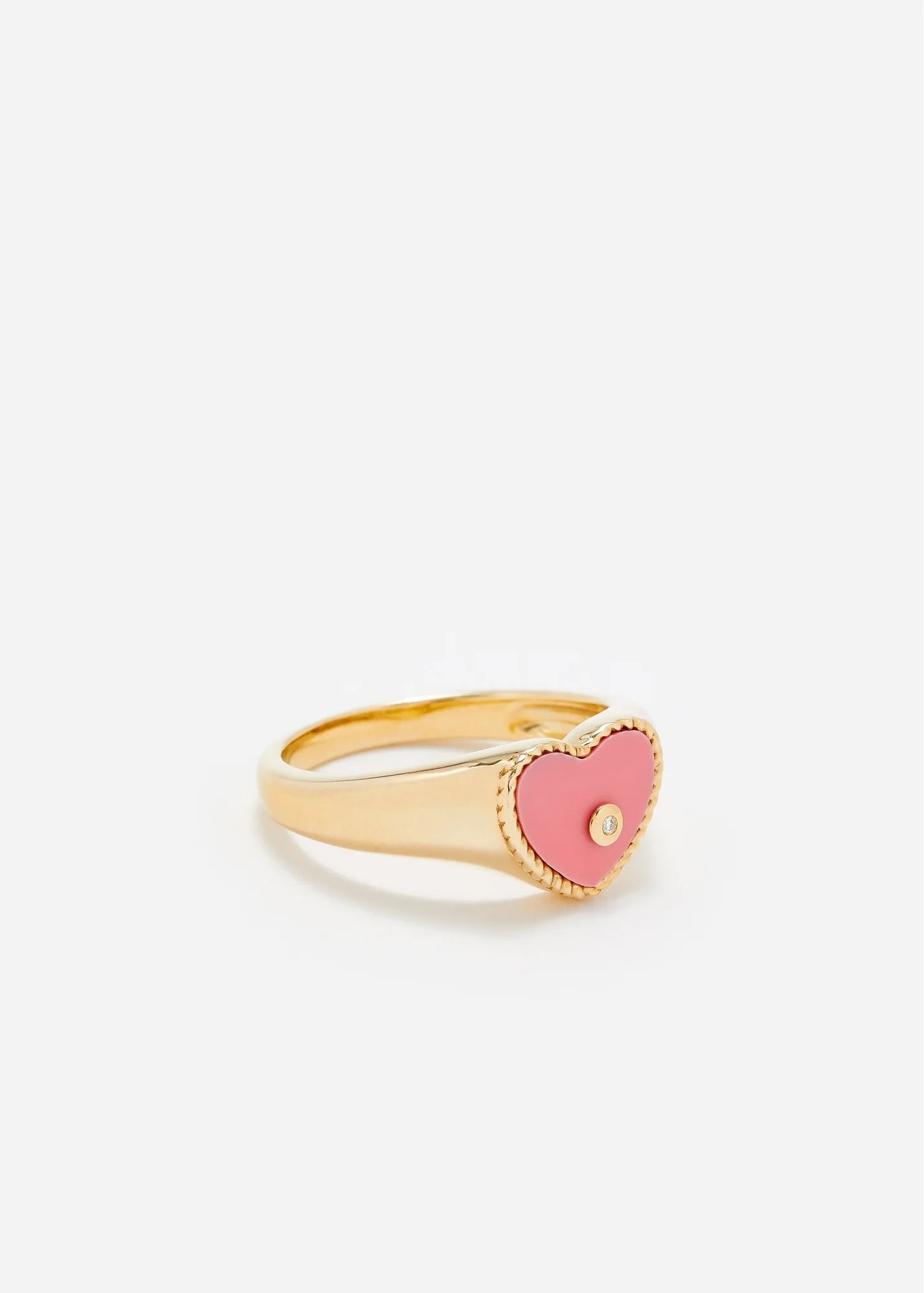 Sygnet w kształcie serca od Yvonne Léon Paris to harmonijne połączenie klasyki i nowoczesności, które przyciąga uwagę swoim unikalnym designem. Wykonany ręcznie w Paryżu z 9-karatowego żółtego złota, pierścień zdobi różowy koral otoczony plecionymi krawędziami oraz diament w oprawie zamkniętej, co nadaje mu wyjątkowego blasku. Wersja mini tego złotego sygnetu, z pewnością oczaruje Cię swoją niewymuszoną lekkością i pięknem.
