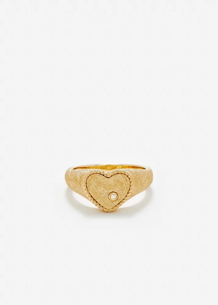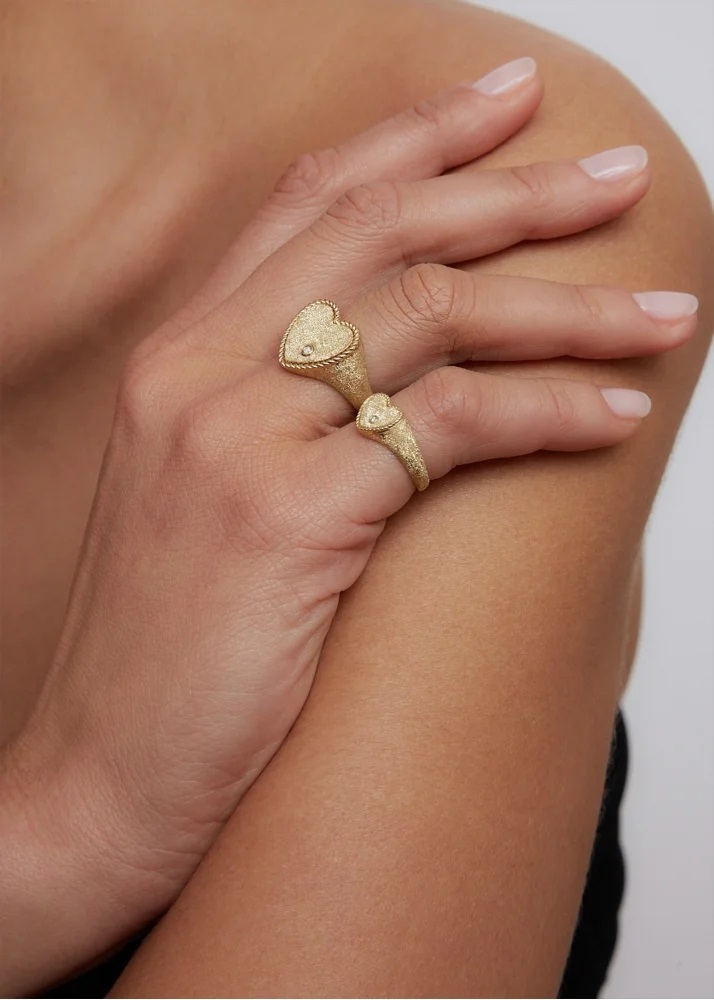 Kultowy złoty pierścionek sygnet w kształcie serca. Wykonany ręcznie w paryskim atelier z 9-karatowego szczotkowanego żółtego złota. Specjalne wykończenie pierścionka tworzy delikatny młotkowany wygląd i dodaje tekstury do gładkiej, złotej powierzchni. Matowe wykończenie zmienia się w połysk gdy dostaje promieni światła. Kształt serca pierścionka Yvonne Léon sprawia, że ​​jest to bardzo przemyślany prezent dla ukochanej osoby jak również dla sprawienia radości samej sobie. Wersja mini tego złotego sygnetu, z pewnością oczaruje Cię swoją niewymuszoną lekkością i pięknem.